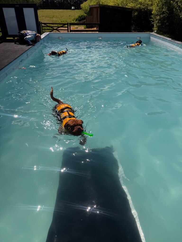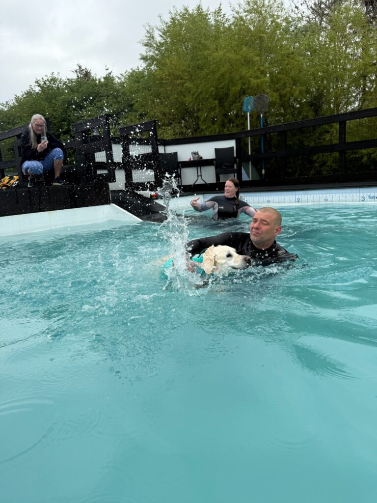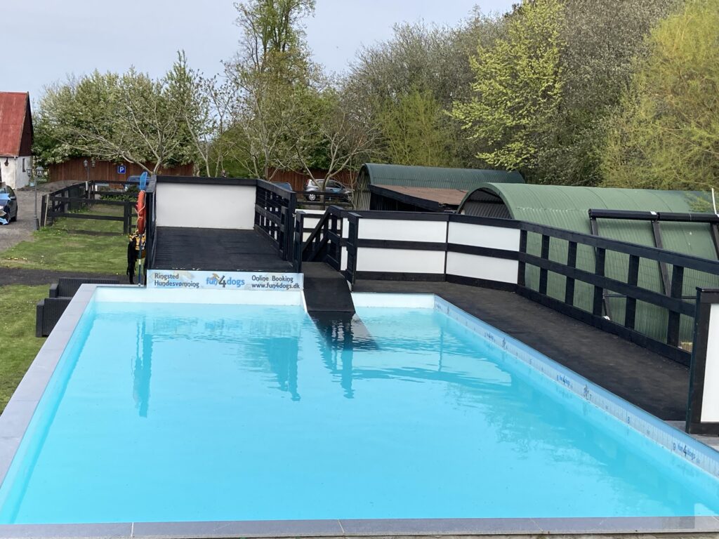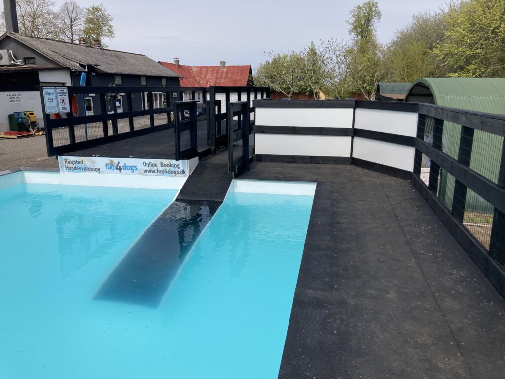 Bassinet rummer 100.000 liter klorvand og er designet til sikker leg og træning. Du må gerne gå med i vandet for at støtte din hund.